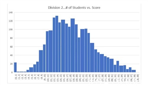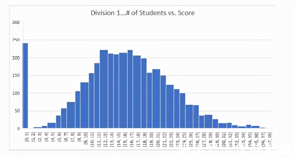 Division1和Division2平均得分都在15至20之间,很少有学生能收获30分以上的成绩。Division1最高分为37分,Division2最高分为38分。